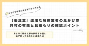 あま市の解体工事では、違法な解体業者を選ばないことが最も重要です。許可の確認、見積もり内容の精査、価格の妥当性を意識することで、トラブルを防ぐことができます。